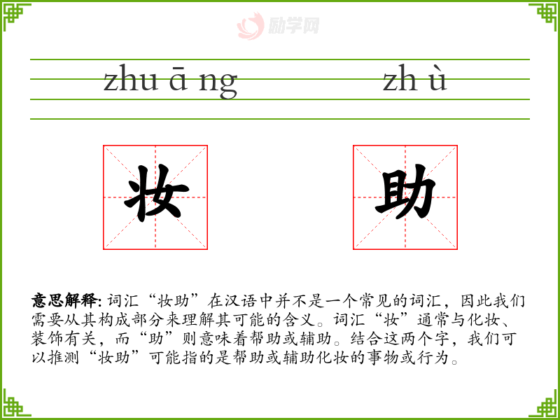 词汇“妆助”在汉语中并不是一个常见的词汇,因此我们需要从其构成部分来理解其可能的含义。词汇“妆”通常与化妆、装饰有关,而“助”则意味着帮助或辅助。结合这两个字,我们可以推测“妆助”可能指的是帮助或辅助化妆的事物或行为。