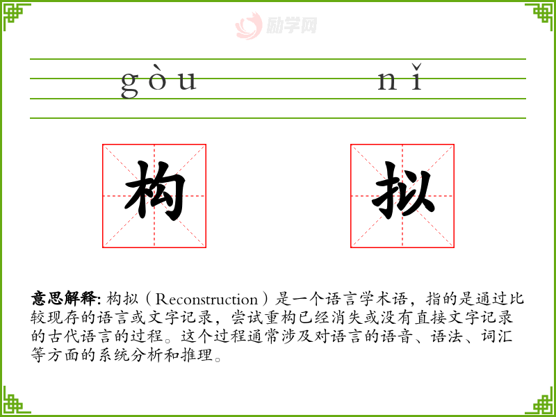 构拟(Reconstruction)是一个语言学术语,指的是通过比较现存的语言或文字记录,尝试重构已经消失或没有直接文字记录的古代语言的过程。这个过程通常涉及对语言的语音、语法、词汇等方面的系统分析和推理。