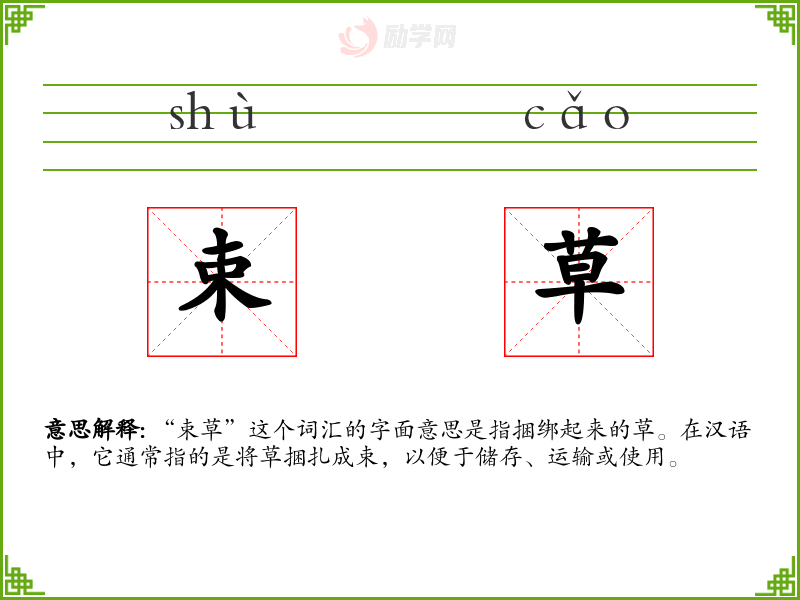 “束草”这个词汇的字面意思是指捆绑起来的草。在汉语中,它通常指的是将草捆扎成束,以便于储存、运输或使用。