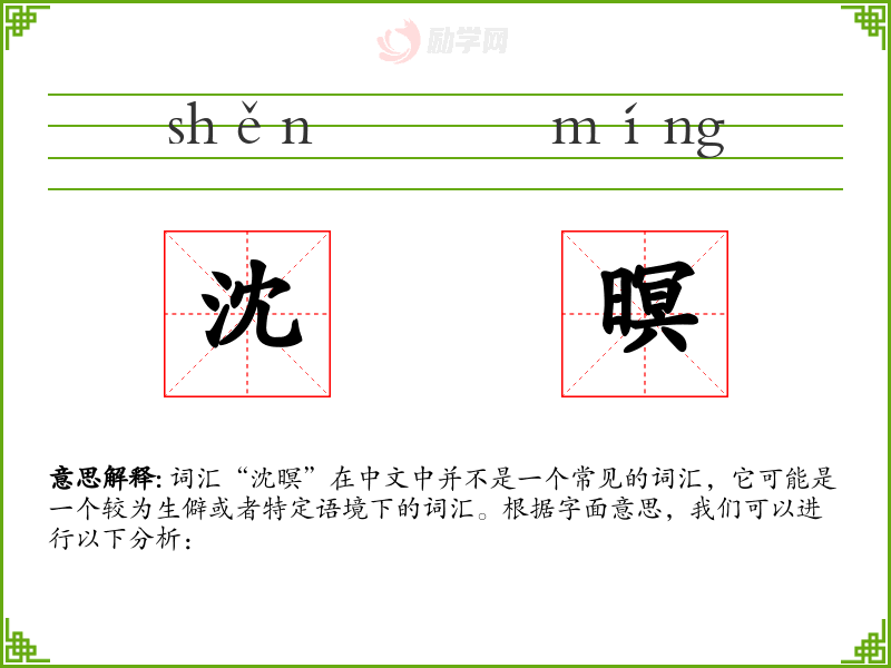 词汇“沈暝”在中文中并不是一个常见的词汇,它可能是一个较为生僻或者特定语境下的词汇。根据字面意思,我们可以进行以下分析: