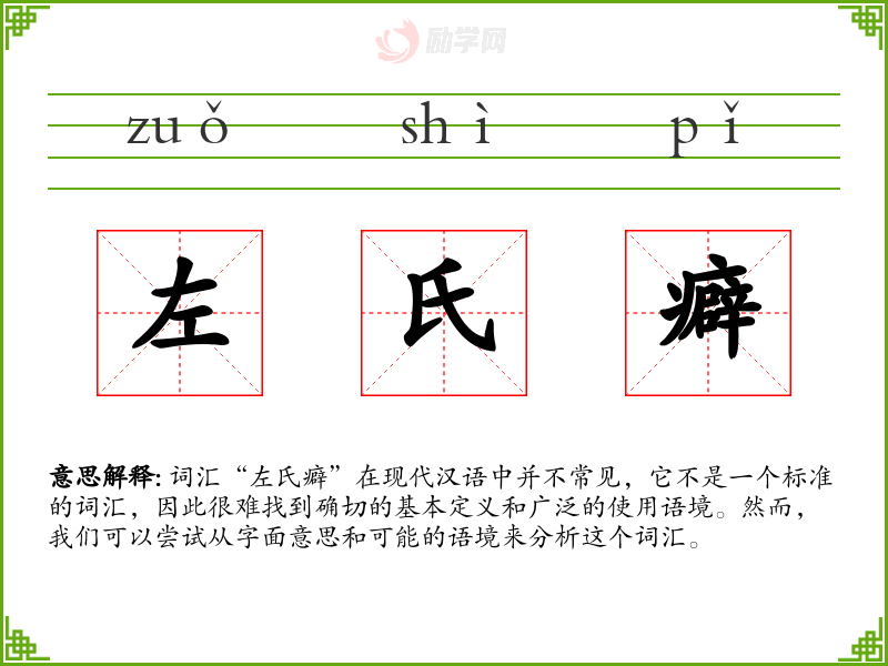 词汇“左氏癖”在现代汉语中并不常见,它不是一个标准的词汇,因此很难找到确切的基本定义和广泛的使用语境。然而,我们可以尝试从字面意思和可能的语境来分析这个词汇。