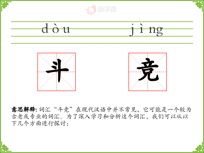词汇“斗竞”在现代汉语中并不常见,它可能是一个较为古老或专业的词汇。为了深入学*和分析这个词汇,我们可以从以下几个方面进行探讨: