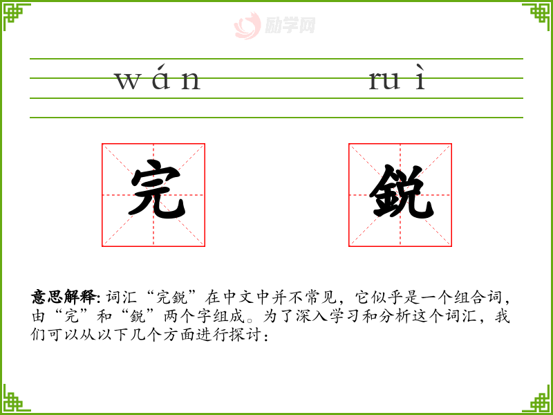 词汇“完鋭”在中文中并不常见,它似乎是一个组合词,由“完”和“鋭”两个字组成。为了深入学习和分析这个词汇,我们可以从以下几个方面进行探讨: