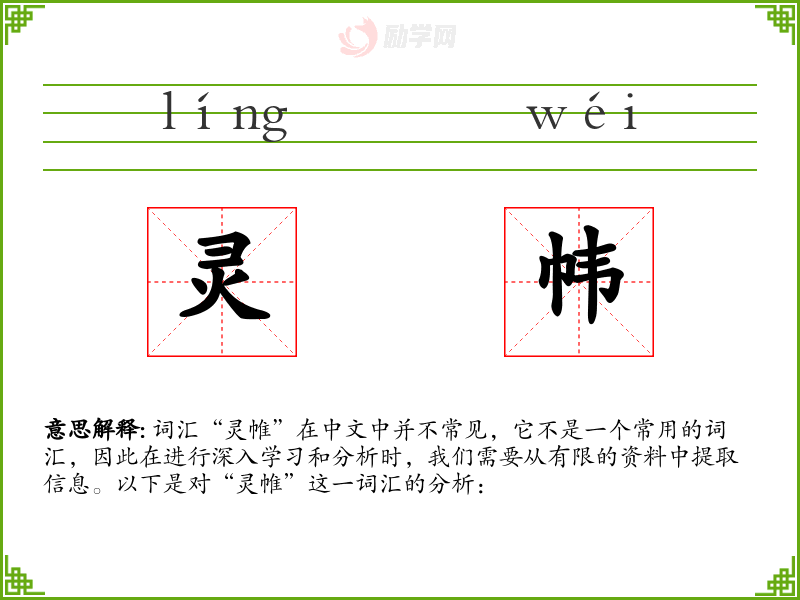 词汇“灵帷”在中文中并不常见,它不是一个常用的词汇,因此在进行深入学*和分析时,我们需要从有限的资料中提取信息。以下是对“灵帷”这一词汇的分析: