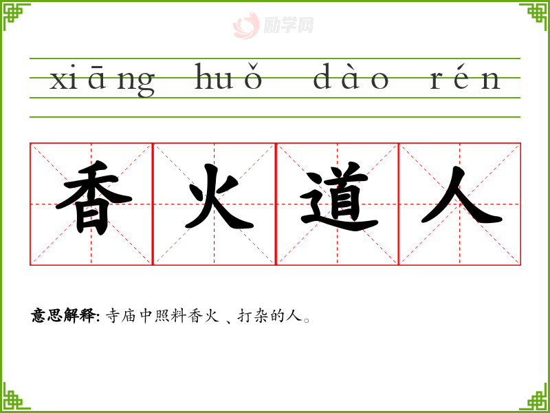 香火道人的意思是:寺庙中照料香火﹑打杂的人。