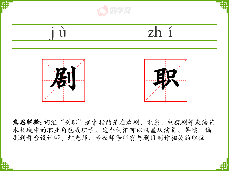 词汇“剧职”通常指的是在戏剧、电影、电视剧等表演艺术领域中的职业角色或职责。这个词汇可以涵盖从演员、导演、编剧到舞台设计师、灯光师、音效师等所有与剧目制作相关的职位。