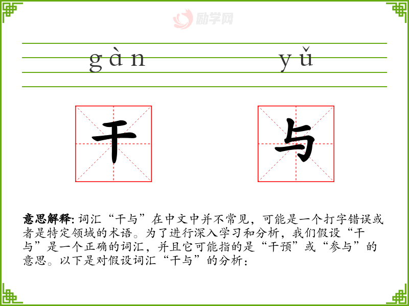 词汇“干与”在中文中并不常见,可能是一个打字错误或者是特定领域的术语。为了进行深入学*和分析,我们假设“干与”是一个正确的词汇,并且它可能指的是“干预”或“参与”的意思。以下是对假设词汇“干与”的分析: