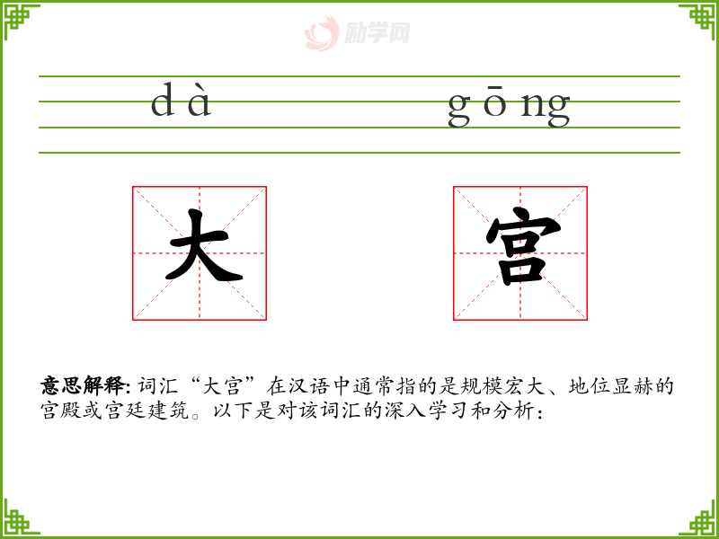 词汇“大宫”在汉语中通常指的是规模宏大、地位显赫的宫殿或宫廷建筑。以下是对该词汇的深入学*和分析: