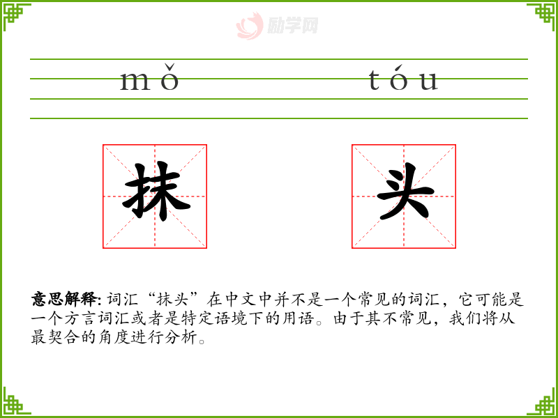 “抹头”作为一个不常见的词汇,其使用和理解需要依赖具体的语境和背景知识。在语言学习和表达中,了解和掌握这样的方言或特定用语可以增加语言的丰富性和多样性。