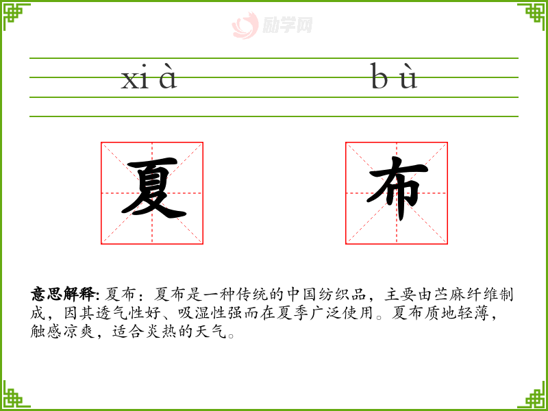 夏布的意思是:用苎麻纤维织成的布,宜于制夏装,故名。为我国特产,多产于江西﹑湖南﹑广东﹑四川等地。