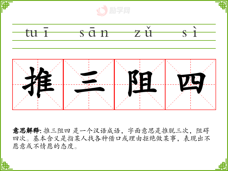 推三阻四 是一个汉语成语,字面意思是推脱三次,阻碍四次。基本含义是指某人找各种借口或理由拒绝做某事,表现出不愿意或不情愿的态度。