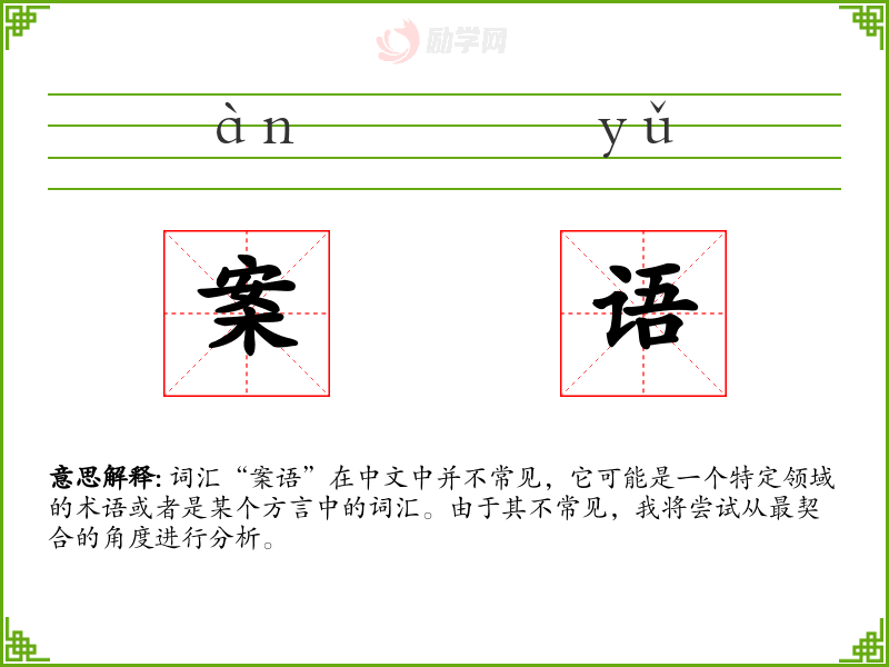 词汇“案语”在中文中并不常见,它可能是一个特定领域的术语或者是某个方言中的词汇。由于其不常见,我将尝试从最契合的角度进行分析。