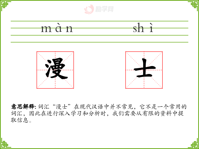 “漫士”这个词在现代汉语中并不常见,它的含义和用法非常有限。在学这个词汇时,我们更多地依赖于字面意义和有限的语境信息。在语言学和表达中,这个词汇的重要性不大,但它可以作为一个例子,展示语言的多样性和复杂性。