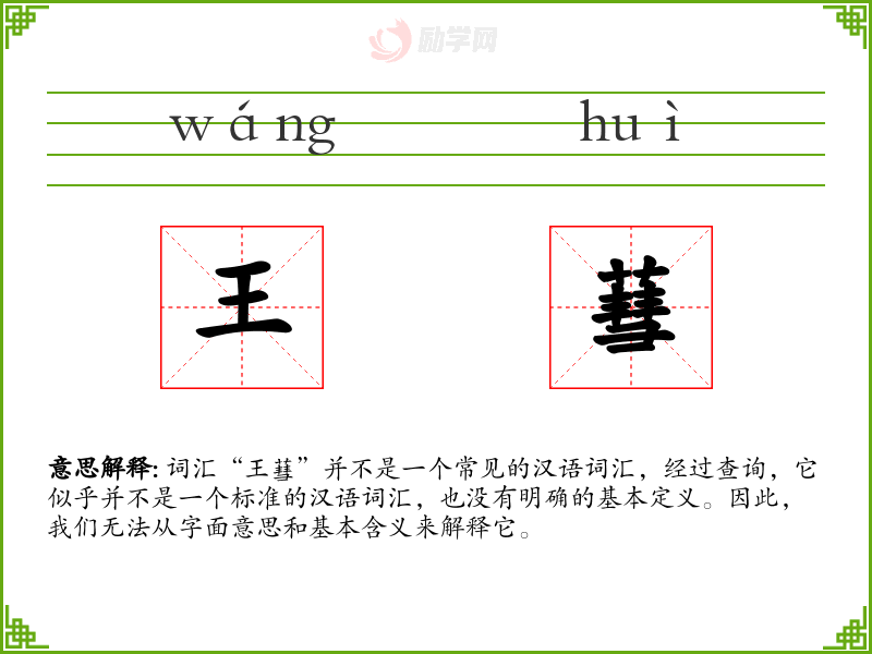 词汇“王蔧”并不是一个常见的汉语词汇,经过查询,它似乎并不是一个标准的汉语词汇,也没有明确的基本定义。因此,我们无法从字面意思和基本含义来解释它。