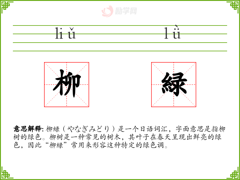 柳緑(やなぎみどり)是一个日语词汇,字面意思是指柳树的绿色。柳树是一种常见的树木,其叶子在春天呈现出鲜亮的绿色,因此“柳緑”常用来形容这种特定的绿色调。
