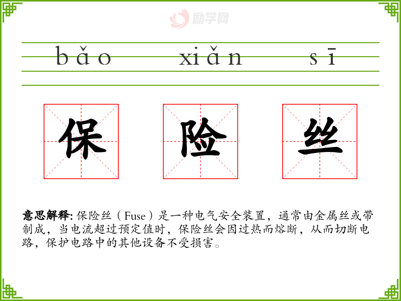 - 反义词:无(保险丝的功能是保护,没有直接的反义词)