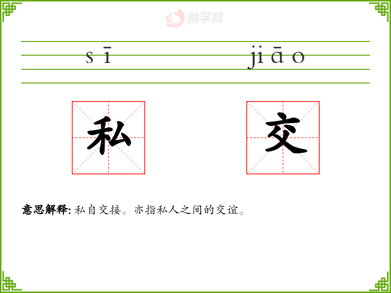 私交的意思是:私自交接。亦指私人之间的交谊。