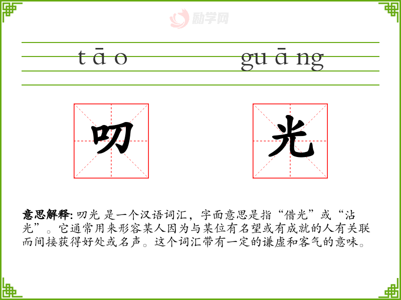 叨光 是一个汉语词汇,字面意思是指“借光”或“沾光”。它通常用来形容某人因为与某位有名望或有成就的人有关联而间接获得好处或名声。这个词汇带有一定的谦虚和客气的意味。