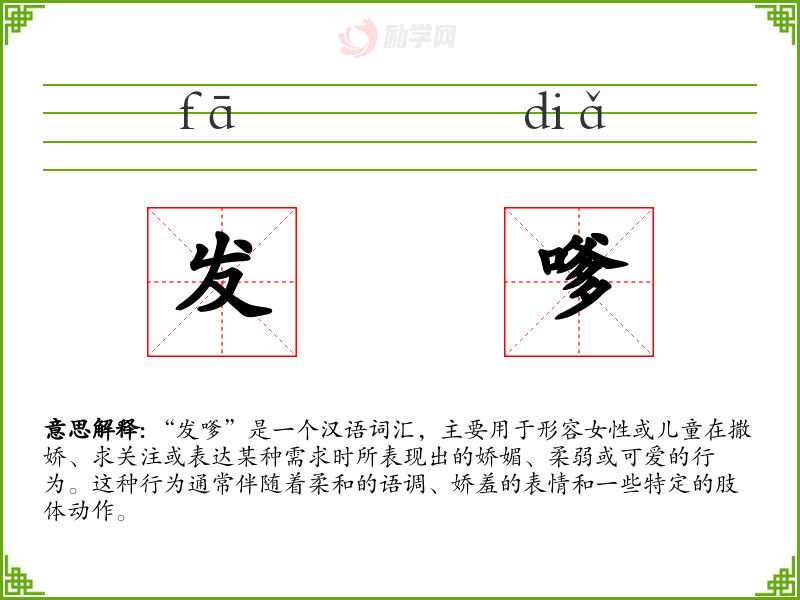 - 口语语境:在日常对话中,“发嗲”通常是一种轻松的表达方式,用来形容某人的撒娇行为,有时也带有一定的调侃意味。