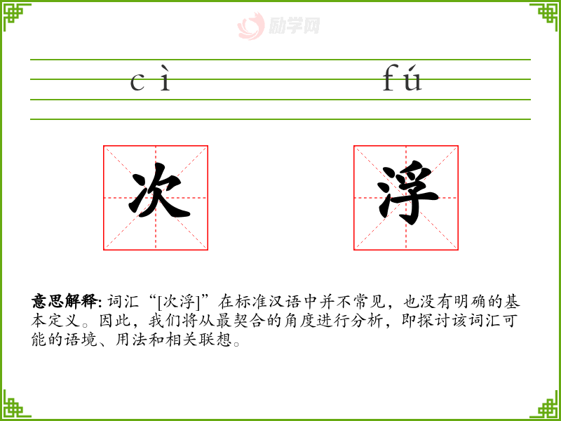 词汇“[次浮]”在标准汉语中并不常见,也没有明确的基本定义。因此,我们将从最契合的角度进行分析,即探讨该词汇可能的语境、用法和相关联想。
