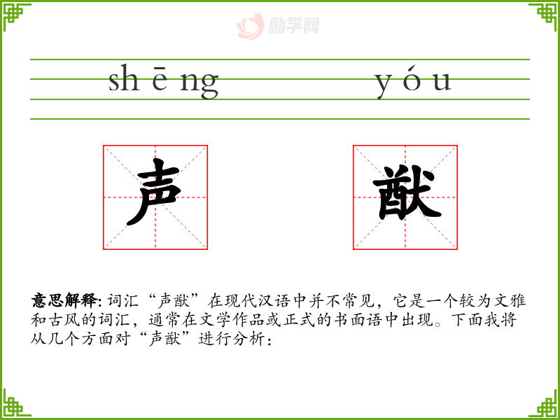 词汇“声猷”在现代汉语中并不常见,它是一个较为文雅和古风的词汇,通常在文学作品或正式的书面语中出现。下面我将从几个方面对“声猷”进行分析: