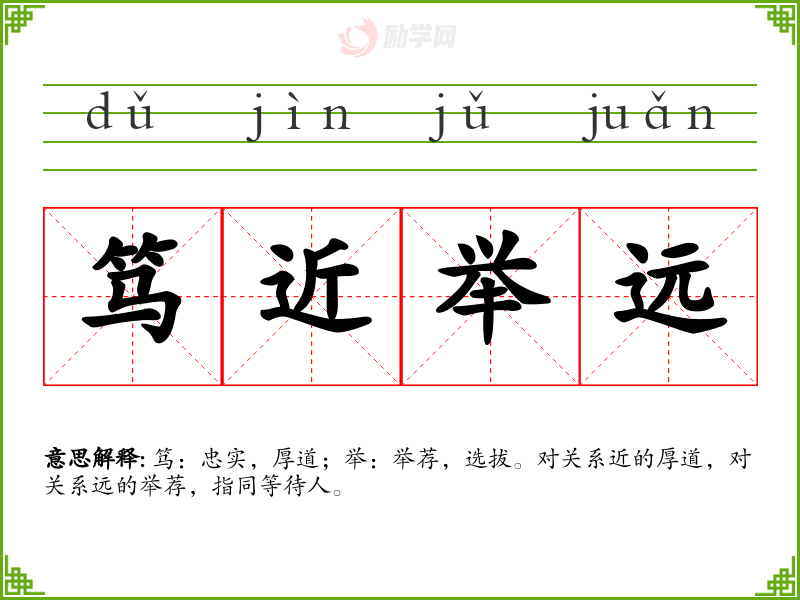 笃近举远的意思是:笃:忠实,厚道;举:举荐,选拔。对关系近的厚道,对关系远的举荐,指同等待人。