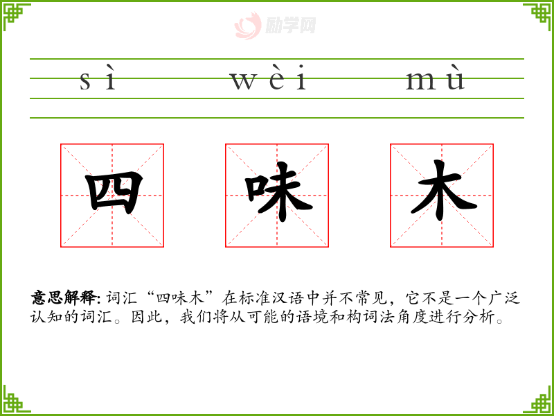 词汇“四味木”在标准汉语中并不常见,它不是一个广泛认知的词汇。因此,我们将从可能的语境和构词法角度进行分析。