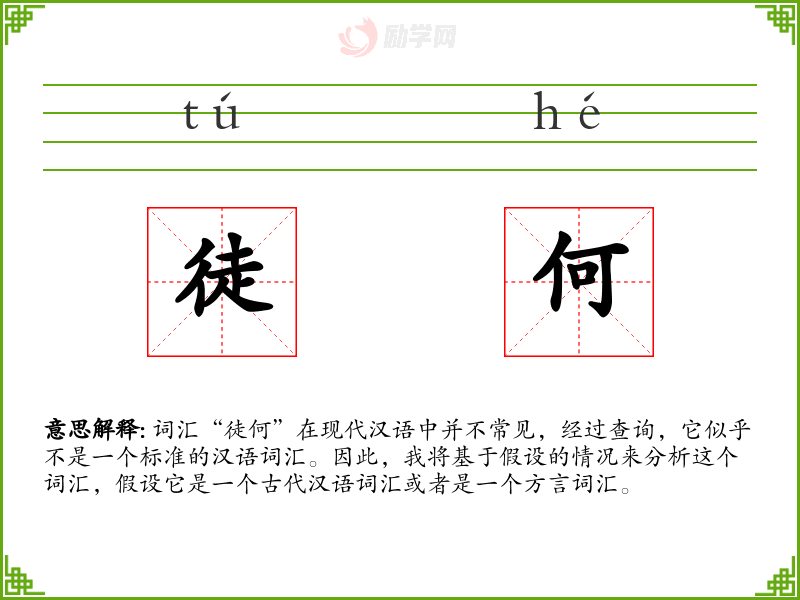 词汇“徒何”在现代汉语中并不常见,经过查询,它似乎不是一个标准的汉语词汇。因此,我将基于假设的情况来分析这个词汇,假设它是一个古代汉语词汇或者是一个方言词汇。