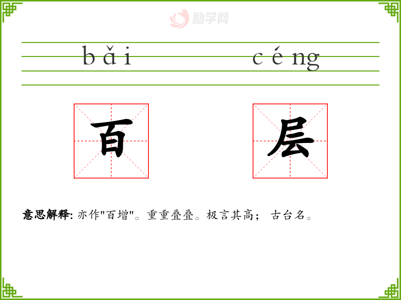 百层的意思是:亦作"百增"。重重叠叠。极言其高; 古台名。
