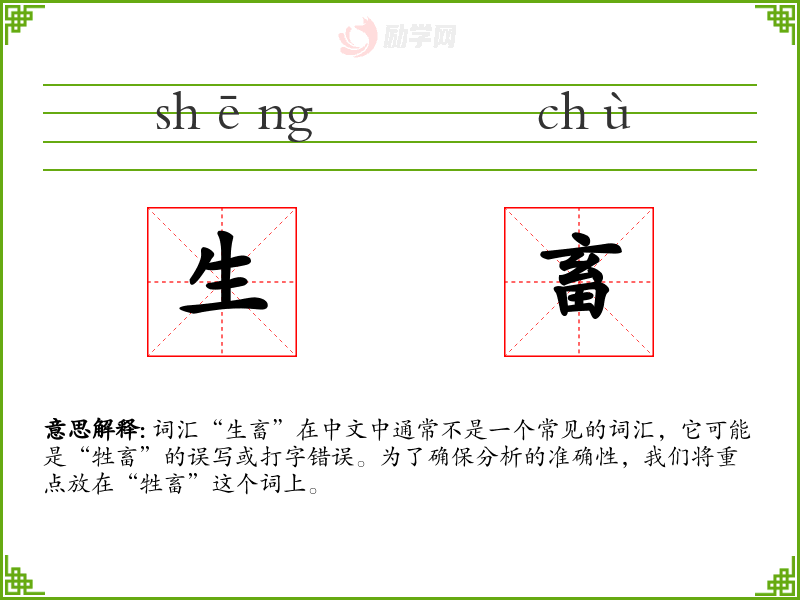词汇“生畜”在中文中通常不是一个常见的词汇,它可能是“牲畜”的误写或打字错误。为了确保分析的准确性,我们将重点放在“牲畜”这个词上。