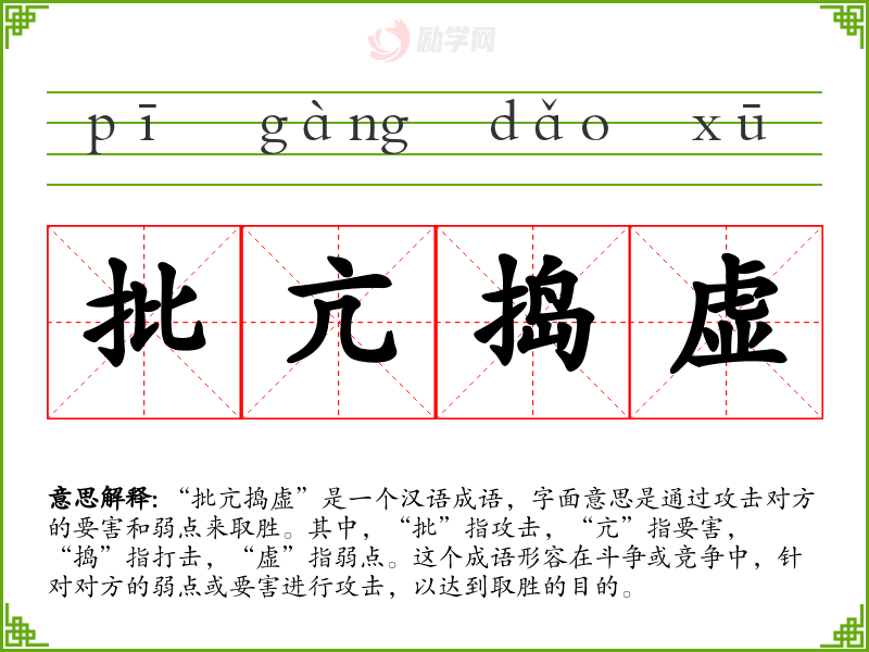 “批亢捣虚”是一个汉语成语,字面意思是通过攻击对方的要害和弱点来取胜。其中,“批”指攻击,“亢”指要害,“捣”指打击,“虚”指弱点。这个成语形容在斗争或竞争中,针对对方的弱点或要害进行攻击,以达到取胜的目的。
