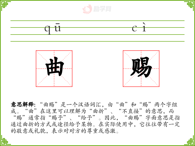 “曲赐”的词源较为传统,源自古代汉语,其中“曲”字在古代有多重含义,包括弯曲、曲折、不直接等。“赐”字则一直有给予、赐予的含义。随着时间的推移,“曲赐”逐渐固定为一种表达感激和尊重的词汇。