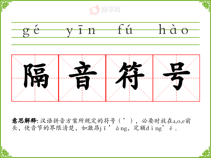 隔音符号的意思是:汉语拼音方案所规定的符号(’),必要时放在a,o,e前头,使音节的界限清楚,如激昂jī’áng,定额dìng’é。