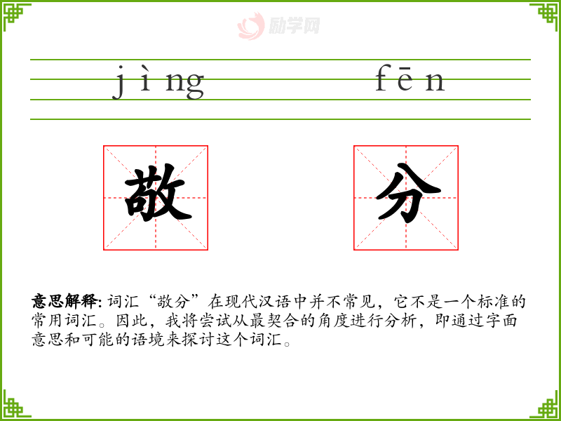 词汇“敬分”在现代汉语中并不常见,它不是一个标准的常用词汇。因此,我将尝试从最契合的角度进行分析,即通过字面意思和可能的语境来探讨这个词汇。