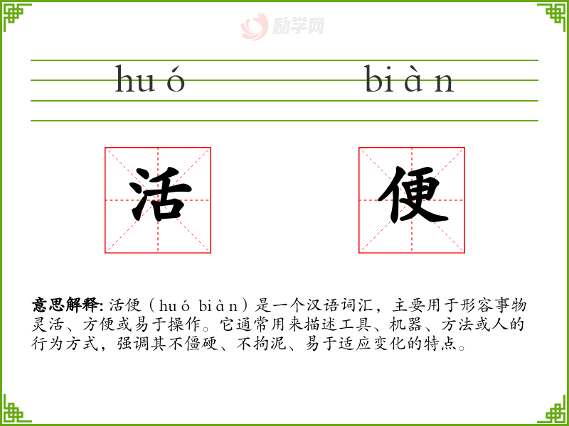 活便(huó biàn)是一个汉语词汇,主要用于形容事物灵活、方便或易于操作。它通常用来描述工具、机器、方法或人的行为方式,强调其不僵硬、不拘泥、易于适应变化的特点。