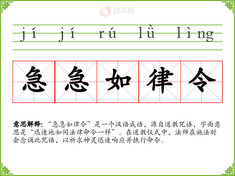 急急如律令的意思是:本是汉代公文用语,后来道士或巫师亦用于符咒的末尾。如同法律命令,必须立即遵照执行。