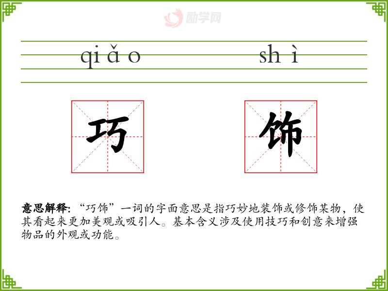 “巧饰”一词的字面意思是指巧妙地装饰或修饰某物,使其看起来更加美观或吸引人。基本含义涉及使用技巧和创意来增强物品的外观或功能。