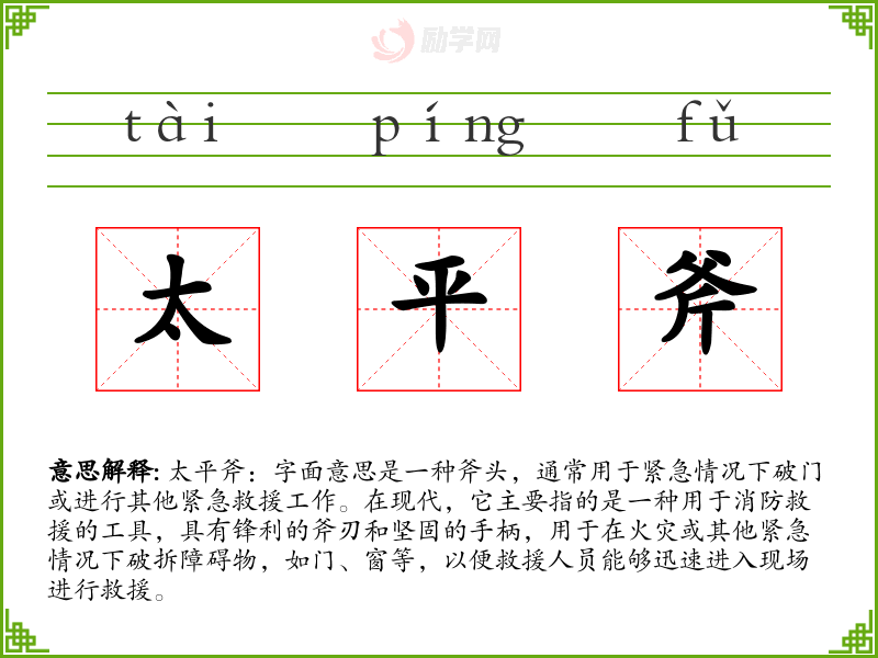 太平斧:字面意思是一种斧头,通常用于紧急情况下破门或进行其他紧急救援工作。在现代,它主要指的是一种用于消防救援的工具,具有锋利的斧刃和坚固的手柄,用于在火灾或其他紧急情况下破拆障碍物,如门、窗等,以便救援人员能够迅速进入现场进行救援。