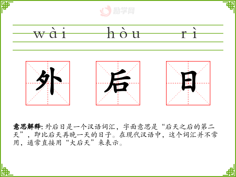 外后日是一个汉语词汇,字面意思是“后天之后的第二天”,即比后天再晚一天的日子。在现代汉语中,这个词汇并不常用,通常直接用“大后天”来表示。