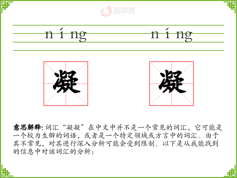 词汇“凝凝”在中文中并不是一个常见的词汇,它可能是一个较为生僻的词语,或者是一个特定领域或方言中的词汇。由于其不常见,对其进行深入分析可能会受到限制。以下是从我能找到的信息中对该词汇的分析: