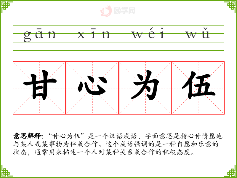 在文学作品中,“甘心为伍”常用来描绘人物的性格或情感态度,如描述一个人愿意与朋友共患难,或者对某种事业的全心投入。在口语中,这个成语可以用来表达对某人或某事的认同和接受。在专业领域,如商业合作或团队建设中,这个词汇可以用来强调团队成员间的和谐与合作精神。