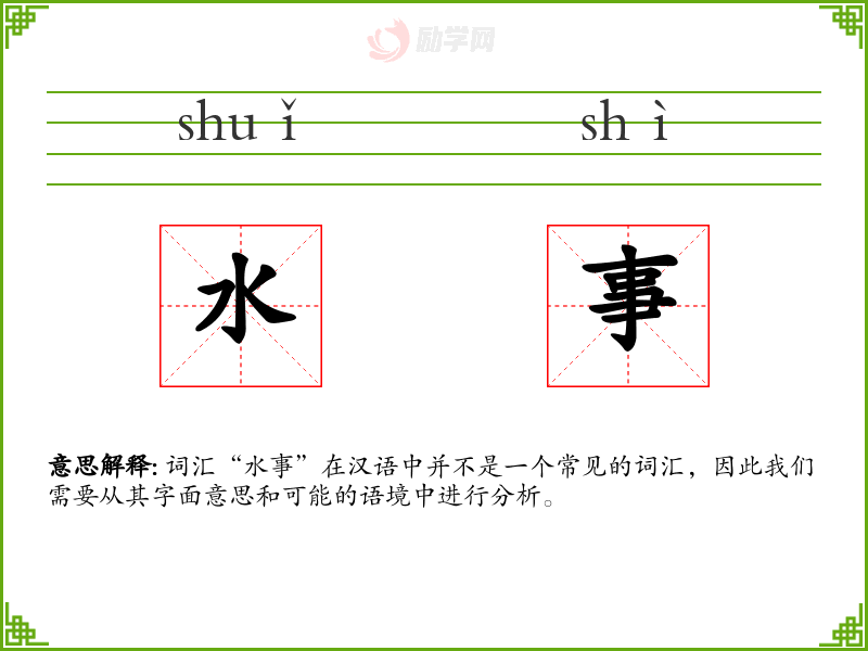 词汇“水事”在汉语中并不是一个常见的词汇,因此我们需要从其字面意思和可能的语境中进行分析。