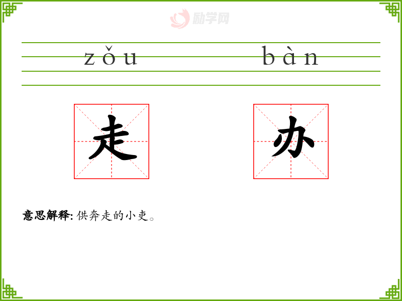 《说文》-走,趋也。 《诗·大雅·緜》-来朝走马。 《仪礼·士相见礼》-某将走见。 《左传·昭公二十三年》-险其走。 《吕氏春秋·期贤》-若蝉之走明火也。 《大戴礼记·诸侯迁庙》-在位者皆反走辟。 《韩非子·喻老》-扁鹊望桓侯而还走。 《韩非子·五蠹》-兔走触株,折颈而死。 《山海经·海外北经》-夸父与日逐走。 《乐府诗集·木兰诗》-双兔傍地走。 明·袁宏道《满井游记》-飞沙走砾。 明·宋濂《送东阳马生序》-录毕,走送之,不敢稍愈约。 《虞初新志·秋声诗自序》-几欲先走。