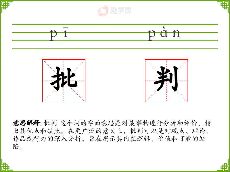 批判 这个词的字面意思是对某事物进行分析和评价,指出其优点和缺点。在更广泛的意义上,批判可以是对观点、理论、作品或行为的深入分析,旨在揭示其内在逻辑、价值和可能的缺陷。