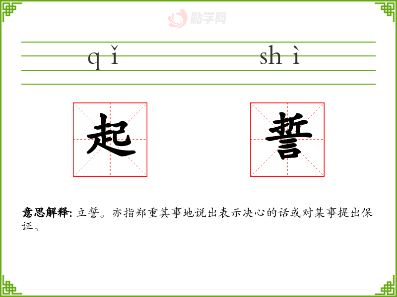 起誓的意思是:立誓。亦指郑重其事地说出表示决心的话或对某事提出保证。
