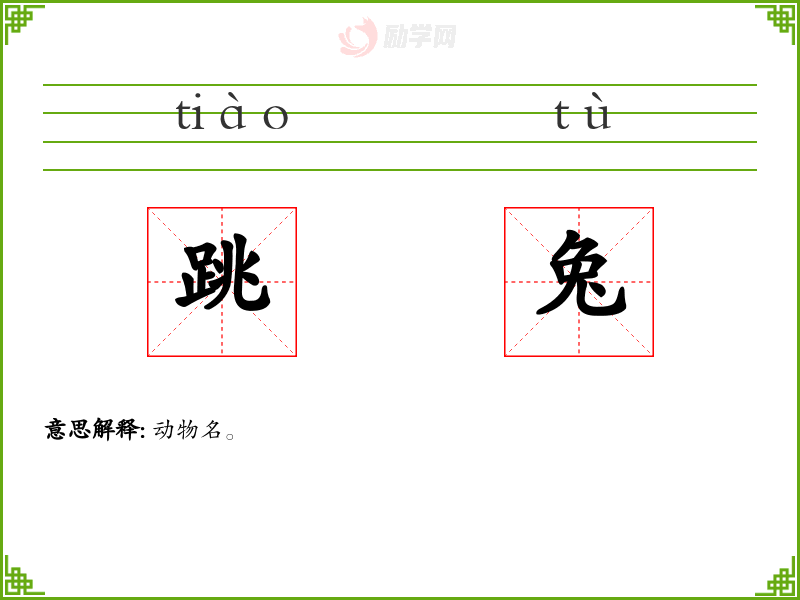 《说文》。其兽前足短后足长,俗字作菟。-兔,兽名。象踞后其尾形。 《论衡·奇怪》-兔舐毫而孕,及其生子,从口而出也。 《诗·召南·兔置》-肃肃兔罝。 《礼记·曲礼》-兔曰明视。 《韩非子·五蠹》-兔走触株。 《乐府诗集·木兰诗》-雄兔脚扑朔。