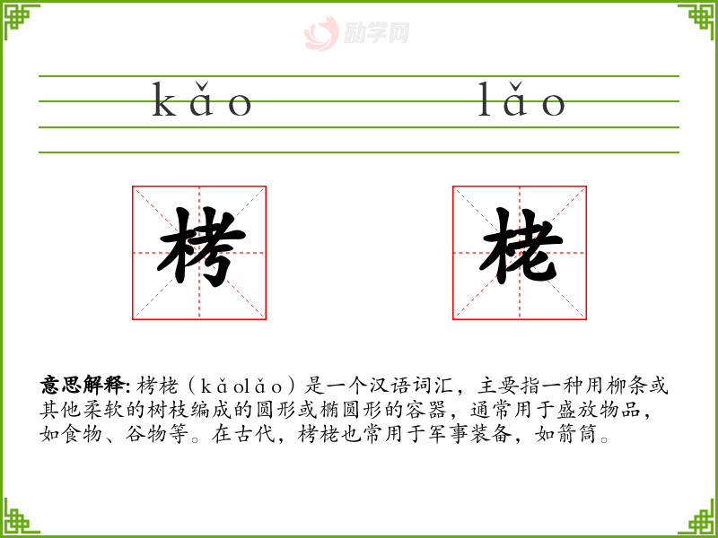 - 同义词:篮子、筐、篓(这些词汇在形状和用途上与栲栳相似,但材质和具体形状可能有所不同)