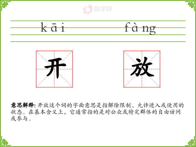 - 文学:在文学作品中,“开放”可能用来描述一个心态或社会的特征,如“开放的心态”意味着愿意接受新思想或观点。