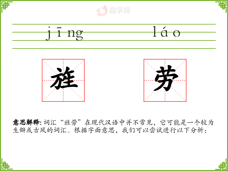词汇“旌劳”在现代汉语中并不常见,它可能是一个较为生僻或古风的词汇。根据字面意思,我们可以尝试进行以下分析:
