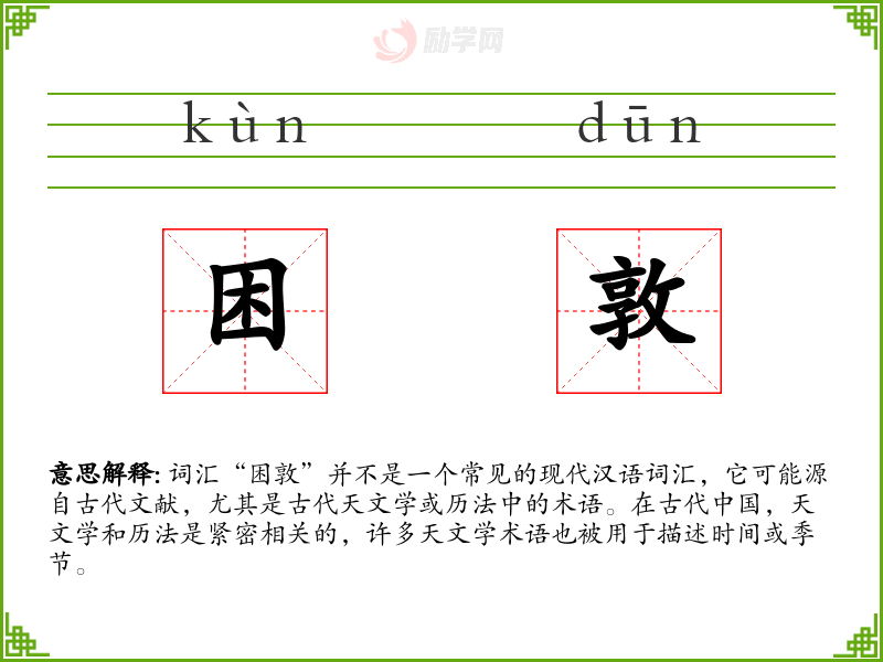 词汇“困敦”并不是一个常见的现代汉语词汇,它可能源自古代文献,尤其是古代天文学或历法中的术语。在古代**,天文学和历法是紧密相关的,许多天文学术语也被用于描述时间或季节。